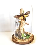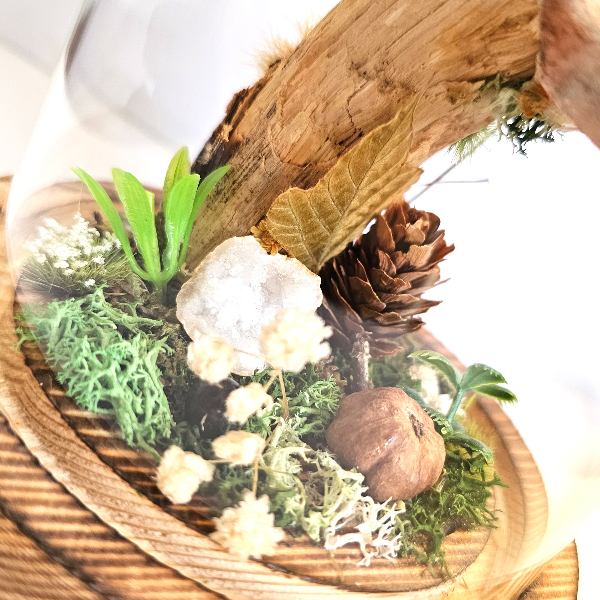 Features: snail shell, moss, dried nature finds, quartz crystal, faux mushroom, florals