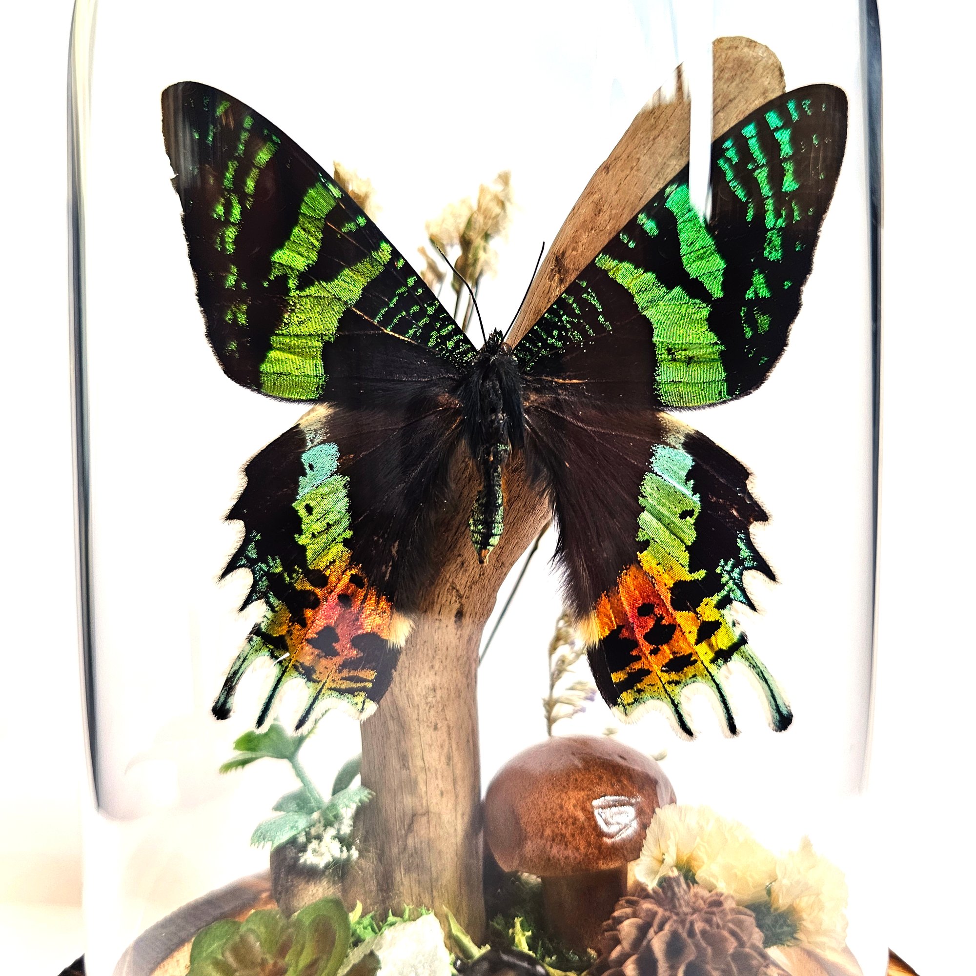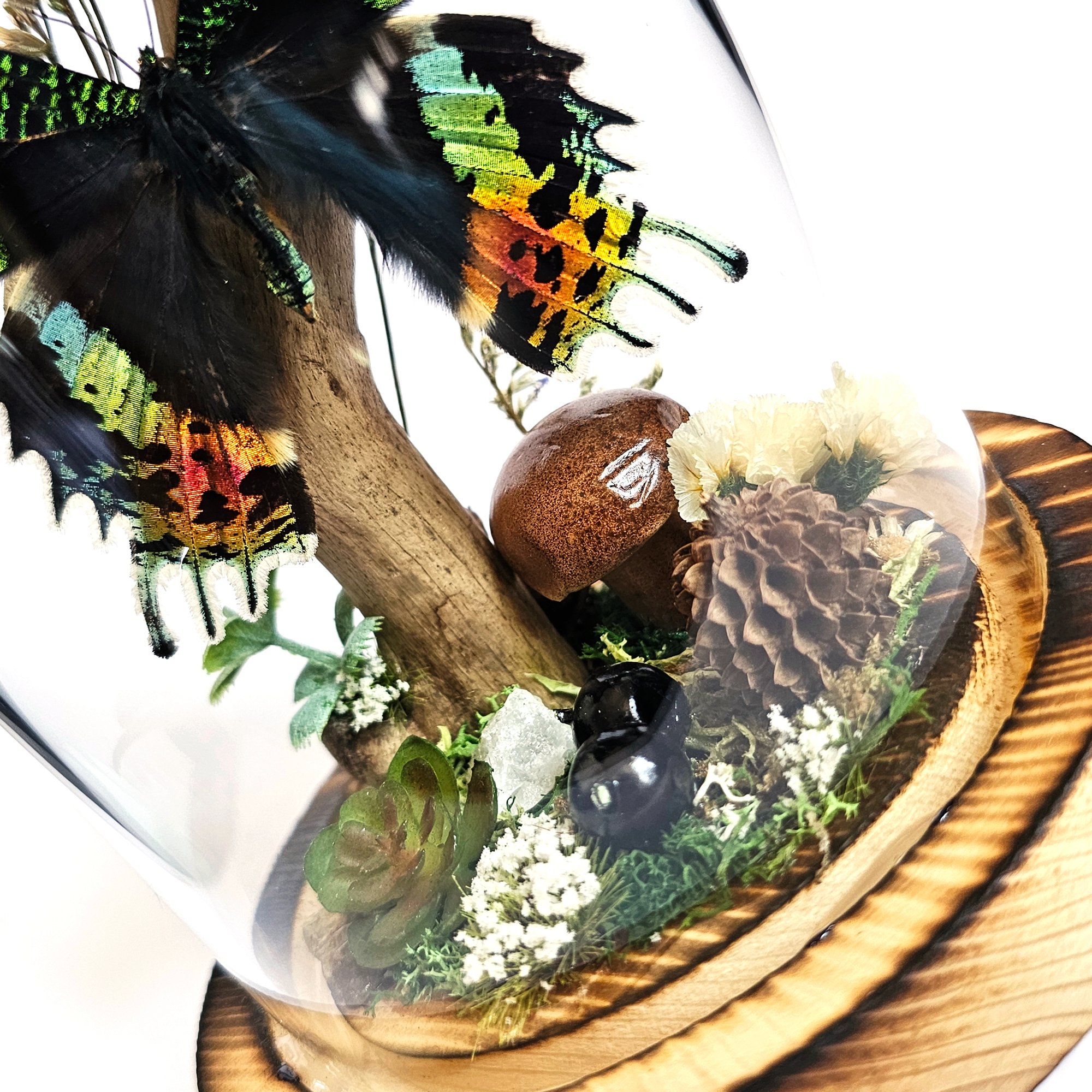 Features: snail shell, moss, dried nature finds, quartz crystal, faux mushroom, florals