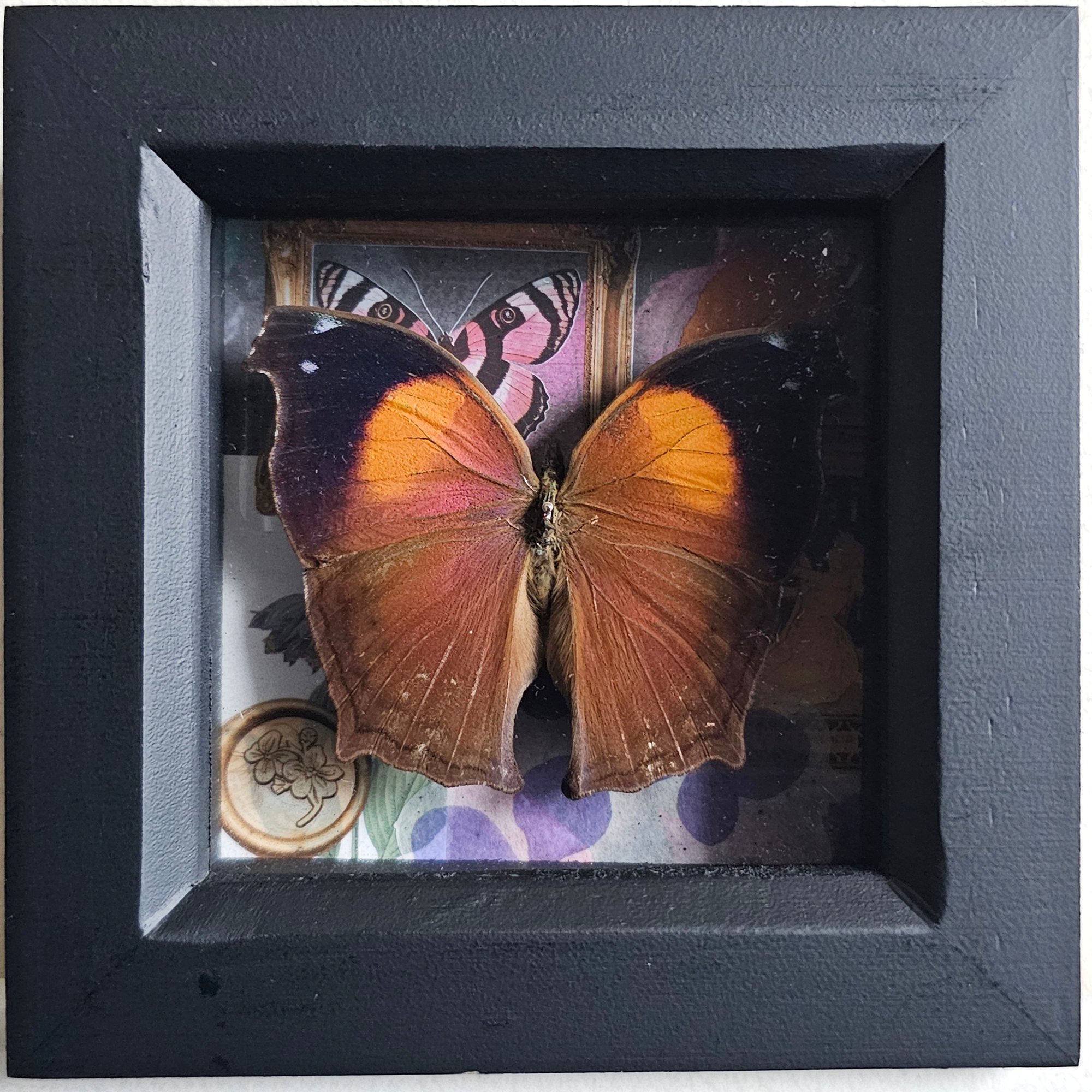 Background: vintage ephemera, stickers, natural history materials, papers and scraps