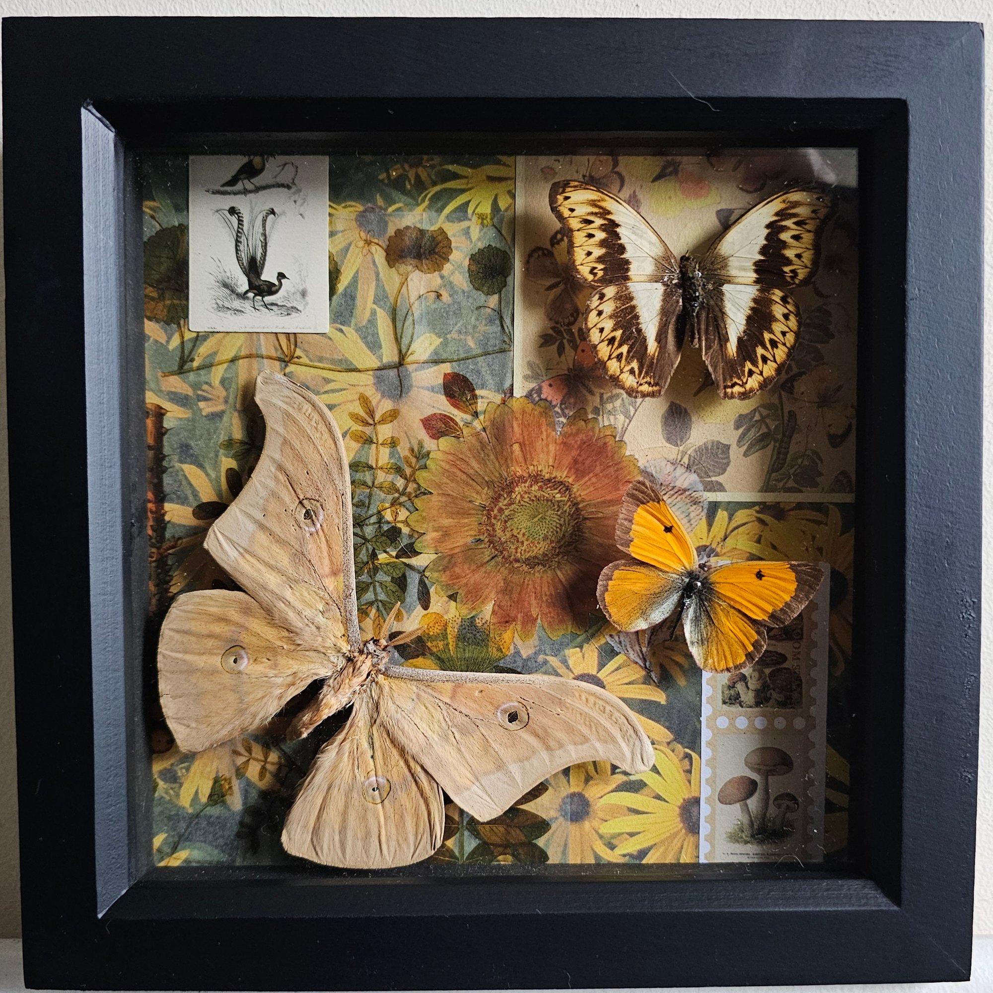 Background: vintage ephemera, stickers, natural history materials, papers and scraps